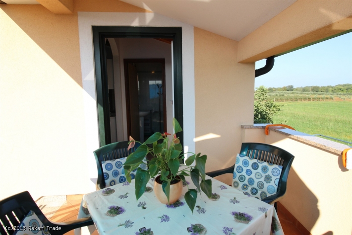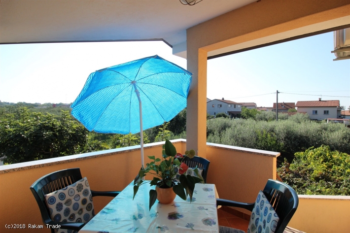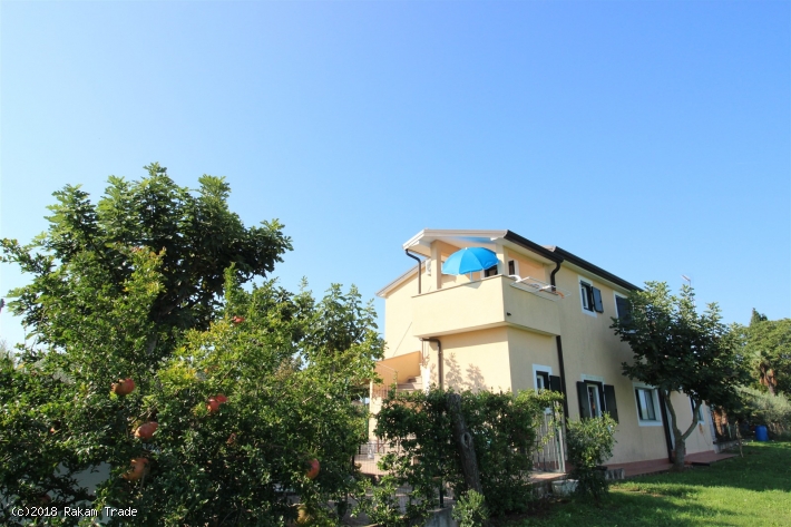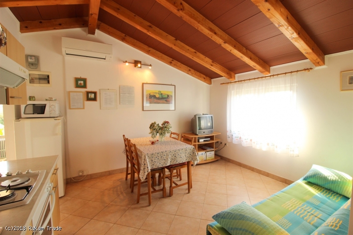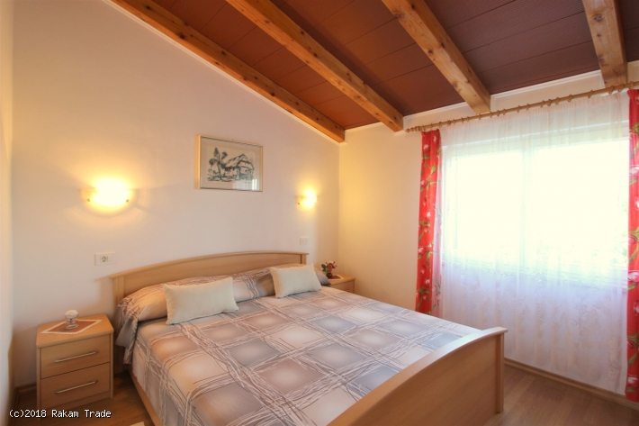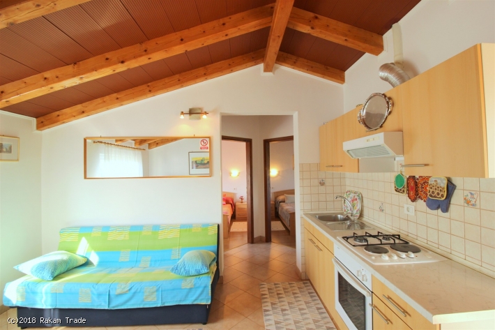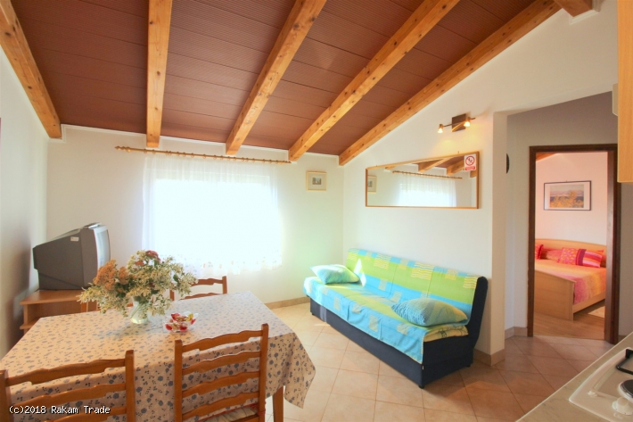 L'appartamento si trova in una zona tranquilla e verdeggiante, ca. 650 m dalla spiaggia. Primo piano, ca. 48 m2. Dispone di due stanze da letto matrimoniali, bagno con doccia e cucina con zona pranzo e divano letto per una persona. Balconcino all'entrata con vista panoramica. Aria condizionata, tv satellitare, accesso internet (Wi-Fi). Parcheggio nel cortile.